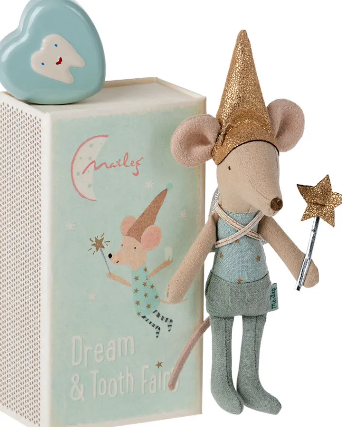 Nachts verbreitet die Zahnfee Feenstaub, sammelt Zähne und sorgt dafür, dass jedes Kind süße Träume hat. Magisch gekleidet in einen glänzenden Hut und einem funkelnden Rucksack kommt in einer Streichholzschachtel mit einer kleinen Zahnbox.