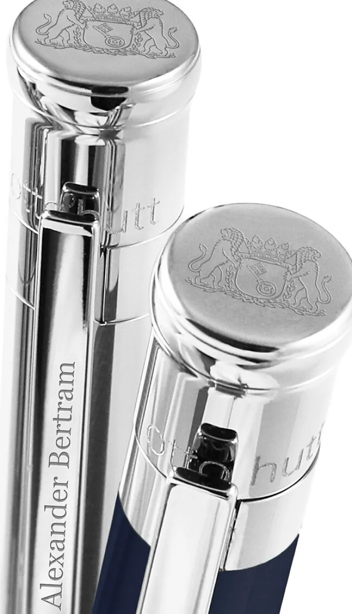 Schaft und Kappe bestehen aus Messing-Vollmaterial, und der aufwendig gefertigte mechanische Federclip ist organisch geformt und perfekt in seiner Funktion. Auf Wunsch können Sie ohne Zusatzkosten Ihren Namen oder den Ihrer Liebsten auf den Federclip des Kugelschreibers gravieren (max. 22 Zeichen) in der Schriftart »Georgia«.