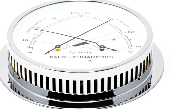 Eigens für DIE ZEIT kreierte die Manufaktur Fischer eine besonders gestaltete Kleinserie dieses edlen Raumklimamessers aus verchromten Messing mit schwarzen Zeigern. Das sorgsam handgefertigte und streng limitierte Produkt misst exakt die Temperatur und die relative Luftfeuchtigkeit im Wohnraum. Ein Blick auf die Schnittstelle der beiden Zeiger reicht, um zu sehen, ob sich das Raumklima im optimalen Bereich befindet oder ob Maßnahmen wie Heizen, Befeuchten oder Lüften erforderlich sind, um eine gesunde Wohlfühlumgebung zu erzeugen. Diese Kombination aus Haarhygrometer und Bimetall-Thermometer ist ein hervorragendes Beispiel feinmechanischer Messtechnik. Nahezu alle Komponenten dieses Präzisionsgerätes fertigt, montiert, justiert und prüft Fischer im eigenen Haus.
