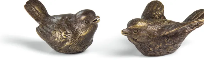 Alle Vögel sind schon da. Dieses muntere Vogelpaar, einer im Flug und einer singend, aus gegossener Bronze setzt effektvoll kleine glänzende Akzente in Ihrem Ambiente.