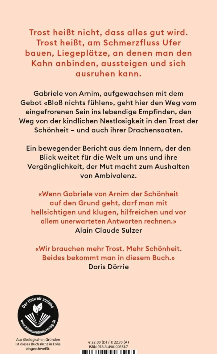 Trost finden. In einer Welt, die so überwältigend, ängstigend, fordernd sein kann. Trost finden im Empfinden von Schönheit, weil das, so Gabriele von Arnim, nicht weniger ist als Selbsterhalt. «Ich brauche Schönheit. Den Trost der Schönheit. Denn wenn ich Schönheit sehe, höre, lese, spüre, dann glaube ich an Möglichkeiten. An Wege, Räume, Purzelbäume.»