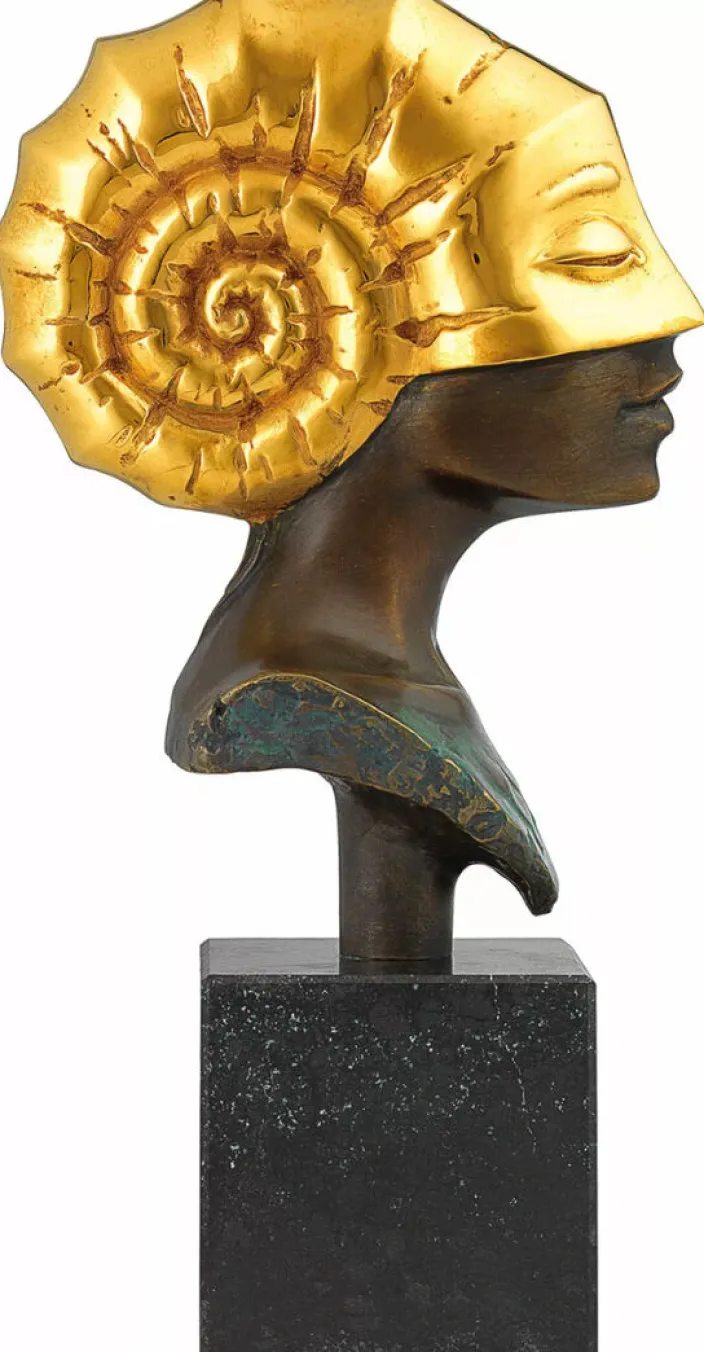 Tauchen Sie ein in die faszinierende Welt von Beckers Skulptur, die die Schönheit eines mathematisch präzisen, urzeitlichen Ammonits mit den gleichmäßigen Zügen eines Frauengesichts auf einzigartige Weise vereint. Diese surreal wirkende Büste strahlt eine zeitlose Eleganz aus und könnte ebenso gut aus einer jahrtausendealten Mythologie stammen. Die Edition dieser faszinierenden Skulptur besteht aus feinster Bronze mit kunstvoller Teilvergoldung. Durch das aufwändige Gießverfahren im Wachsausschmelzverfahren und die sorgfältige Patinierung entsteht ein Meisterwerk von unvergleichlicher Qualität. Jedes Exemplar dieser außergewöhnlichen Skulptur ist streng limitiert auf nur 99 Stück und trägt die handsignierte und nummerierte Kennzeichnung. Das Format der Skulptur beträgt inklusive des Diabassockels etwa 27 x 8,5 x 13,5 cm (H/B/T). Mit einem Gewicht von ca. 2,7 kg erhält die Skulptur eine angenehme Größe und ein solides Gewicht, das ihre Präsenz unterstreicht.