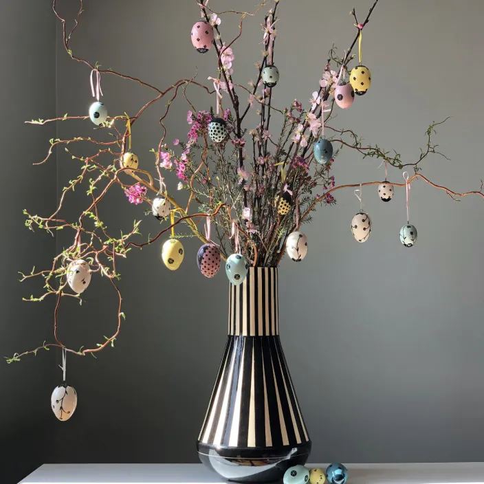 Gefertigt wird die Vase auch heute noch in Handarbeit in den Hedwig Bollhagen Werkstätten für Keramik. Mit schwarzer Engobe wird auf den reinen Tonscherben das von Hedwig Bollhagen entwickelte Originaldekor aufgetragen, durch Scraffitotechnik verfeinert und transparent glasiert. Die Hedwig Bollhagen Werkstätten für Keramik ist die einzige direkt aus dem Bauhaus hervorgegangene Manufaktur, die Design-Keramik mit Originalformen herstellt und neu interpretiert.