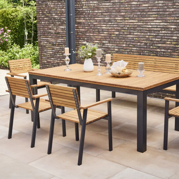 Die elegante Serie Bozen von Siena Garden steht für Nachhaltigkeit und elegantes Design für Ihren Garten. Das hochwertige Robinienholz FSC® 100% ist von Natur aus widerstandsfähig gegen Fäulnis, Insekten und Witterungseinflüsse, was das Material zu einer der langlebigsten Optionen für den Einsatz im Freien macht. Dies bedeutet, dass die Serie Bozen eine lange Lebensdauer hat und Ihnen viele Jahre Freude bereiten wird. Das pulverbeschichtete und in matt anthrazit eingefärbte Aluminium-Gestell ist sehr widerstandsfähig gegen Witterungseinflüsse wie Regen, Sonne und Schnee sowie gegen Korrosion und Rost. Darüber hinaus ist es sehr einfach zu pflegen und erfordert nur eine regelmäßige Reinigung mit Seifenwasser, um Schmutz und Ablagerungen zu entfernen.