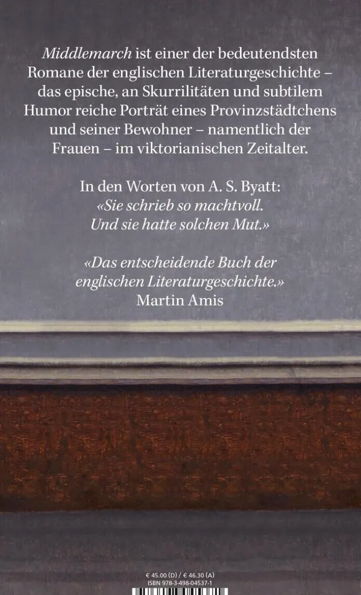 „Middlemarch“, der berühmteste Roman von Mary Ann Evans, die unter dem männlichen Pseudonym George Eliot auftrat, um als schreibende Frau wahrgenommen zu werden, gilt bis heute zu Recht als Höhepunkt englischer Romankunst des 19. Jahrhunderts; seine Mischung aus Realismus, farbiger Personenzeichnung, psychologischer Einfühlung, naturwissenschaftlichem und philosophischem Interesse und historischem und sozialgeschichtlichem Bewusstsein ist unerreicht. Das Buch zeichnet ein lebhaftes Gemälde von den Skurrilitäten der englischen Provinz und ihrer Bewohner. Es ist mit scheinbar leichter Hand geschrieben, in einem Stil, den eine verhaltene, doch stets präsente elegante Ironie prägt, wie sie ähnlich vollendet in der englischen Literatur vielleicht am ehesten Jane Austen ein halbes Jahrhundert vor George Eliot zu Gebote stand. Für Virginia Woolf war es „das herrliche Buch“ schlechthin.