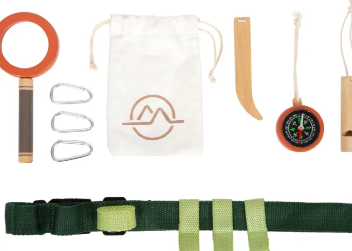 - Inhalt: 1 Gürtel, 1 Signalpfeife, 1 Lupe, 1 Pinzette, 1 Kompass, 1 Sammelbeutel, 1 Seil, 3 Karabiner