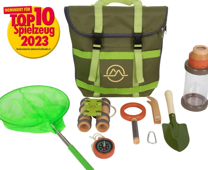 - Inhalt: 1 Rucksack, 1 Insektenglas mit integrierter Lupe, 1 Holzfernglas, 1 Kescher mit Teleskoparm, 1 Kompass mit Trageband, 1 Lupe mit Vergrößerungsfunktion, 1 Pinzette, 1 Schaufel, 1 Karabiner