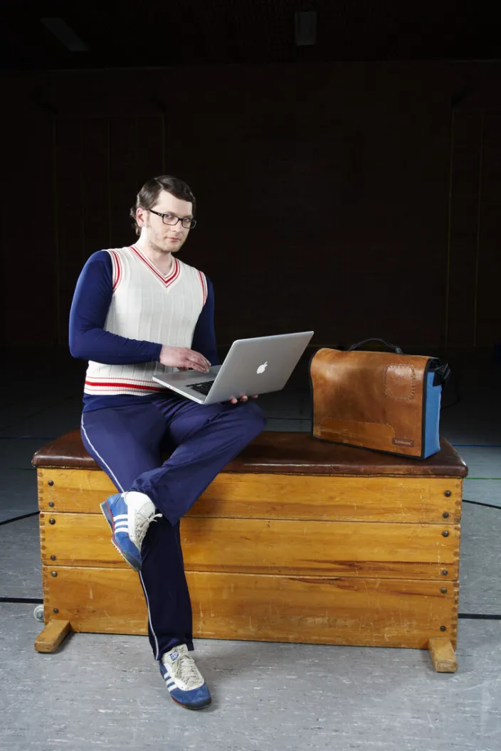Gepolsterte Notebook-Tasche aus gebrauchtem Sportgeräte-Leder und weißer LKW-Plane. Geeignet für alle gängigen Notebooks zwischen 13″ und 15″. Umsteckbares, großes Innenfach für sehr viel Zubehör, Aufsetztasche, Schulter-Schwerlastgurt und Beckengurt für Radfahrer.