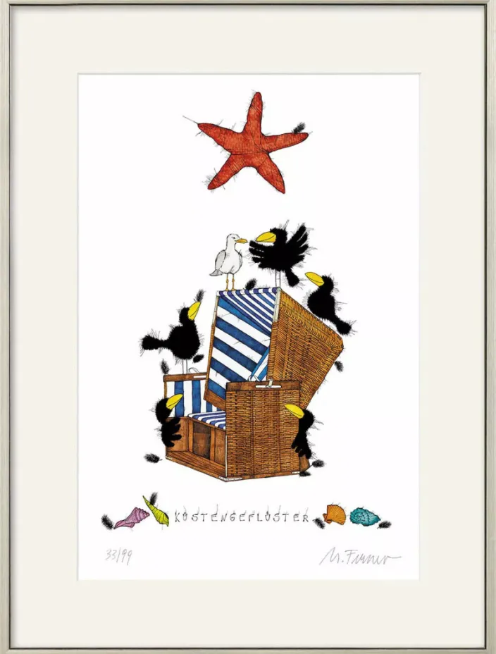 Das Gemälde »Küstengeflüster« von Künstler Michael Ferner fängt auf feinsinnige Weise die entspannte Atmosphäre eines Strandurlaubs ein. Das Bild ist Teil einer limitierten Edition auf hochwertigem 375g Tintoretto Stucco Gesso Papier. Jedes Exemplar ist nummeriert, handsigniert und auf nur 99 Blatt und 9 Belegexemplare begrenzt. Das Kunstwerk wird in einer silberfarbenen Massivholzleiste mit einem Schrägschnittpartout gerahmt und ist verglast.