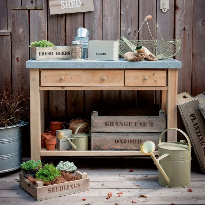 Die charmant rustikale Erscheinung macht diesen großen Holzarbeitstisch mit viel Stauraum zum stilvollen Helfer beim Pflanzen und Umtopfen. Ausgestattet mit 3 Schubladen und gefertigt aus handselektierter, naturbelassener Fichte aus der EU mit charakteristischer Maserung, hält er dank der strapazierfähigen Zink-Oberfläche jeder Gärtner-Arbeit langlebig stand.