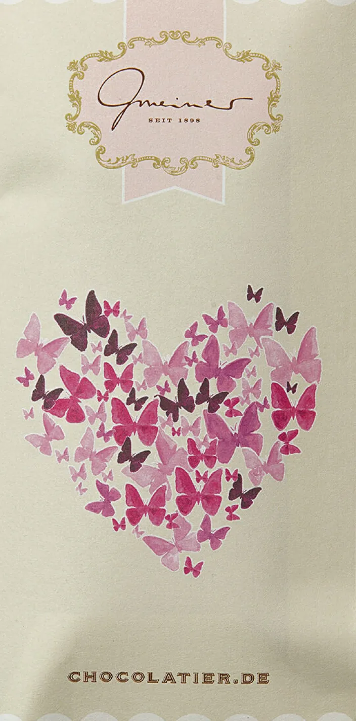 Tafelschokolade: Hausgemachte Vollmilchschokoladetafel mit mind. 40 % Kakao. Liebevoll verpackt in Papier mit Schmetterlings-Motiv.