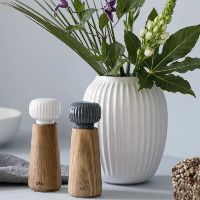 Mit der gelungenen Kombination aus natürlichem Eichenholz und dem, für die Porzellanformen der Serie »Hammershøi« charakteristischen, rillenförmigen Muster des Porzellankopfes fügt die Mühle der dänischen Traditionsmarke Kähler sich toll in verschiedene Einrichtungsstile ein und bringt skandinavisches Flair in Ihr Zuhause.