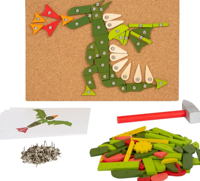- Inhalt: 100 Ziernägel, 126 Holzelemente, Korkbrett und Holzhammer, inkl. sechs Bildvorlagen und Aufbewahrungsbox