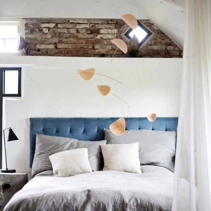 Dieses Mobile der dänischen Manufaktur »Flensted Mobiles« erinnert an sanft schwebende Wolken, die den Himmel durchziehen. Es verzaubert mit seinen eleganten Bewegungen und lädt den Betrachter zu einer leichten und bezaubernden Reise ein.