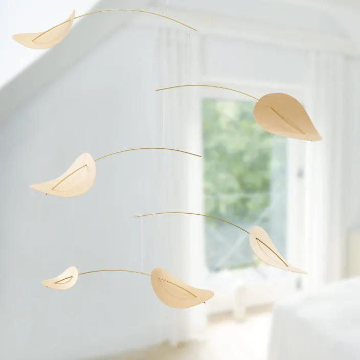 Die Blätter des Drifting Clouds Mobiles bestehen aus hochwertigem finnischen Sperrholz, was ihm eine natürliche Ästhetik verleiht und es perfekt in moderne, skandinavische Einrichtungsstile integriert. Hergestellt in Dänemark.