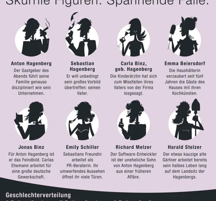 Der alte Firmenpatriarch und reiche Unternehmer Anton Hagenberg hatte seine Kinder auf den herrschaftlichen Landsitz der Familie eingeladen, um seinen 70. Geburtstag zu feiern. Das große Festessen wurde serviert und der Abend versprach, wunderschön zu werden … Doch als Anton im Laufe der Nacht nach einem Schwächeanfall ins Krankenhaus gebracht werden musste, nahm der Geburtstag ein unschönes Ende. Der Grund für Antons Ohnmacht war eine lebensgefährliche Vergiftung. Einer der anwesenden Gäste hat versucht, das reiche Familienoberhaupt zu ermorden. Anton Hagenberg will diese Angelegenheit familienintern klären. Deshalb sind heute Abend alle Anwesenden erneut zusammen gekommen. Die Frage lautet: Was ist gestern Abend passiert? Wer hat versucht, den alten Hagenberg umzubringen?