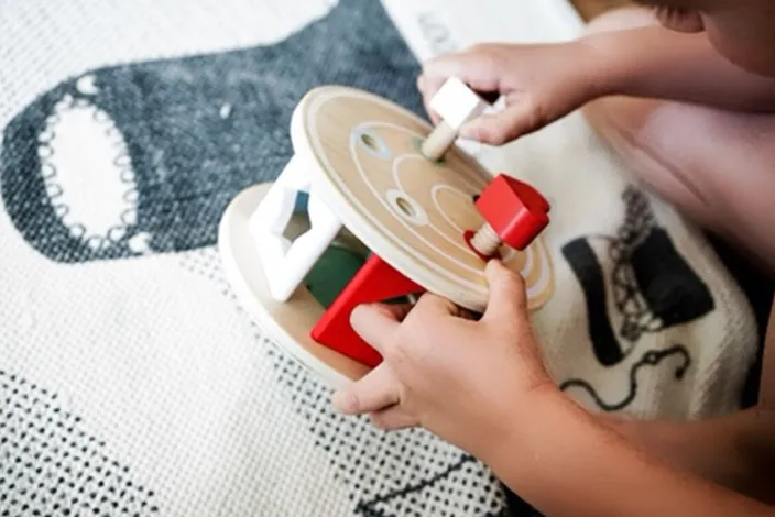 Diese »Nachzieh-Stecktier Schnecke« mit elastischen Fühlern und freundlichen Augen motiviert zum Laufen lernen. Während des Ziehens dreht sich das abnehmbare Schneckenhaus, erzeugt ein klackerndes Geräusch durch die darin befindlichen Stecksteine und fördert spielerisch die Farb- und Formerkennung durch das Anschrauben der Steine an der zweiten Seite des Schneckenhauses. Die Kombination von natürlichem Holz und modernen Farben macht dieses Ziehtier zu einem echten Blickfang! Das abnehmbare Schneckenhaus ist separat als Aufbewahrung für die bunten Steckelemente nutzbar. Dank einer seitlichen Tür mit Gummibandverschluss und einer Perle als Griff sind die Spielsteine leicht zugänglich. Aufgeschraubte Spielsteine sorgen zudem für eine geräuschärmere Aufbewahrung, da sie beim Ziehen nicht mehr im Haus klappern. Ein cleveres Motorik-Spielzeug für steck- und schraubbegeisterte Kinder.