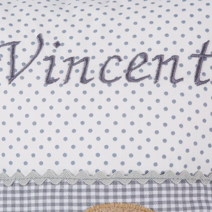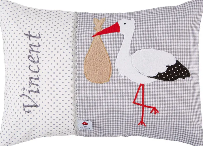 Die individualisierbaren Kissen von Glückspilz werden aus 100 % Baumwolle in Deutschland hergestellt. Die individuelle Bestickung des Wunschnamens wird per Hand aufgetragen und sorgt mit der jeweils passenden Zackenlitze dafür, dass jedes Kissen zum Unikat wird. Das aufwendig in Handarbeit hergestellte Namenskissen »Storch« ist für Jungen und Mädchen gleichermaßen geeignet und ein wunderschönes Geschenk zur Geburt, Taufe oder zum Geburtstag.
