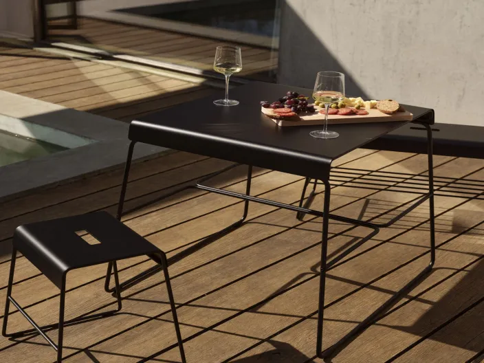 Der pulverbeschichtete Cafétisch ist eine naheliegende Wahl für urbane Menschen, die Wert auf langlebiges Design legen. Der Stil ist zeitlos, die Verarbeitung robust. Aufgrund seiner guten Anwendbarkeit ist der Tisch ein wahrer Magnet für Geselligkeit und Hygge. Er wartet nur darauf, als Abstellfläche für Cocktails oder den täglichen Kaffee dienen zu dürfen. Nicht zu vergessen: Für ein perfektes Café-Ambiente kann der A-Stool mit der A-Bench kombiniert werden.