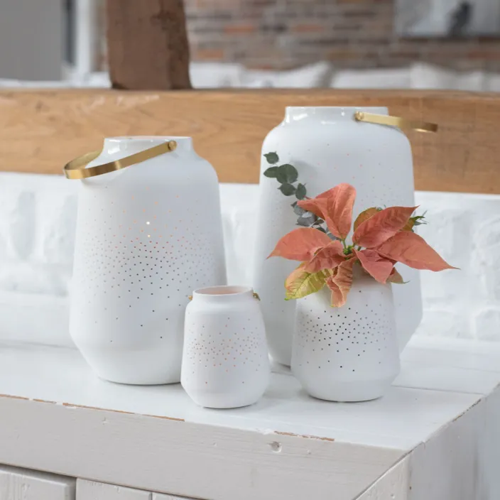 Diese handgefertigte Porzellanlaterne von Räder ist ein echter Blickfang für jede Jahreszeit. Die zarte Teelicht-Laterne aus Porzellan, kombiniert mit einem eleganten Metallgriff in Weiß-Kupfer, schafft ein warmes und einladendes Licht. Die feinen, eingearbeiteten Löcher lassen das Licht durchscheinen und zaubern eine stimmungsvolle Atmosphäre, die an einen funkelnden Sternenhimmel erinnert. Ob als Geschenk oder für das eigene Zuhause – diese Laterne ist eine wunderschöne Dekoration, die Liebe, Glück und Geborgenheit symbolisiert.