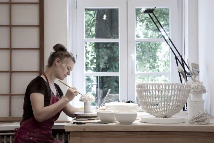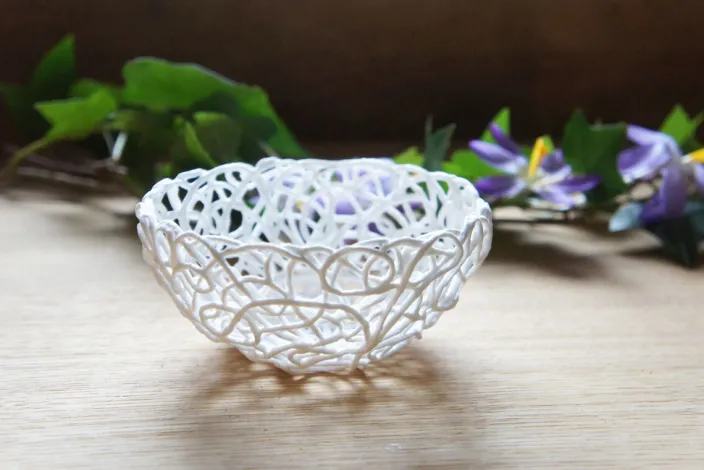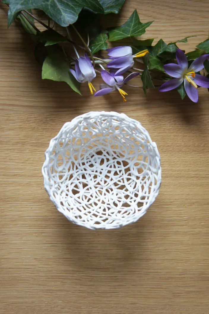 Die handgefertigte Kordelporzellanschale punktet nicht nur durch das Design: Sie eignet sich auch bestens zum Aufbewahren verschiedenster Gegenstände. Bei der von Silke Decker entwickelten Technik des Kordelporzellans taucht sie Wollfäden in Gießporzellan und legt sie einzeln zu Geflechten aus, wodurch die einzigartige Optik entsteht. Im Ofen verbrennen die Fäden und hinterlassen das reine Porzellan, während die Struktur der Kordel erhalten bleibt. Silke Deckers Dekoobjekte punkten durch Leichtigkeit, Stabilität und Funktionalität.