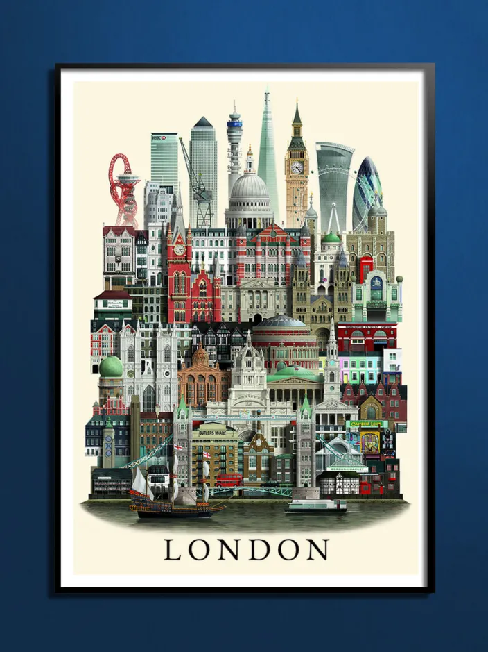 Das Poster »London« von Martin Schwartz vermittelt Ihnen die Atmosphäre der englischen Hauptstadt. Machen Sie einen Spaziergang durch die Straßen Londons und Sie können nicht anders, als sich von der Atmosphäre verzaubern zu lassen. Imposante Gebäude aus der Kolonialzeit stehen neben glitzernden Wolkenkratzern. Ein verzweigtes Netz von U-Bahn-Linien, ständig belebte Straßen und die sich windende Route der Themse durch die Stadt wirken wie Adern in einem riesigen urbanen Organismus, der niemals schläft. Vielleicht versucht der Orbit Tower genau das zu symbolisieren, wenn seine roten und verdrehten Stahlkonstruktionen in der Nähe des Olympiastadions von 2012 in den Himmel ragen. Dieses Poster zeigt die Essenz Londons und bietet Ihnen alles von viktorianischer und georgianischer Architektur bis hin zu den modernen Wahrzeichen, die die Skyline der Stadt ausmachen.