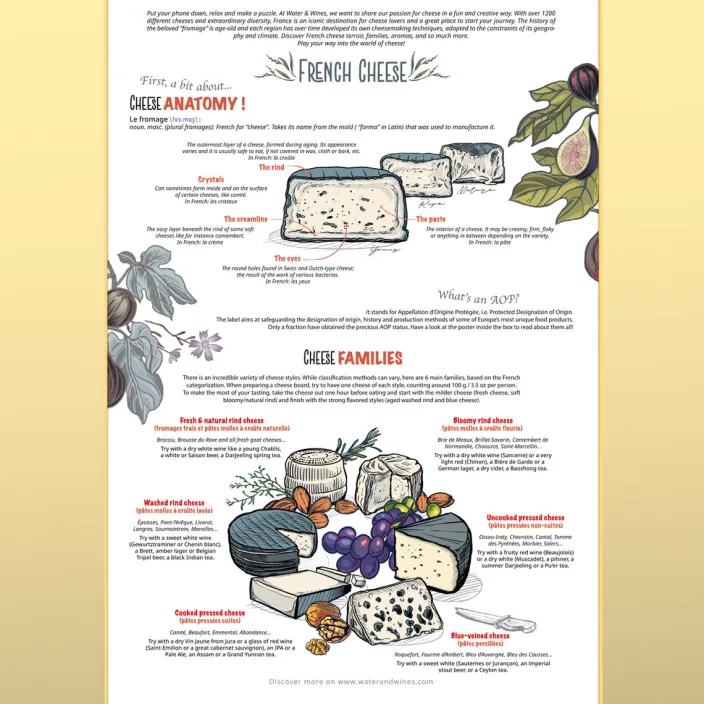 Stürzen Sie sich in das faszinierende Abenteuer der französischen Käsewelt mit unserem Puzzle „French Cheese“ von Water & Wines. Mit über 80 verschiedenen Käsesorten entführt Sie dieses Puzzle in die vielfältigen Käseregionen Frankreichs, von den bekannten Klassikern bis hin zu gut gehüteten Geheimtipps.