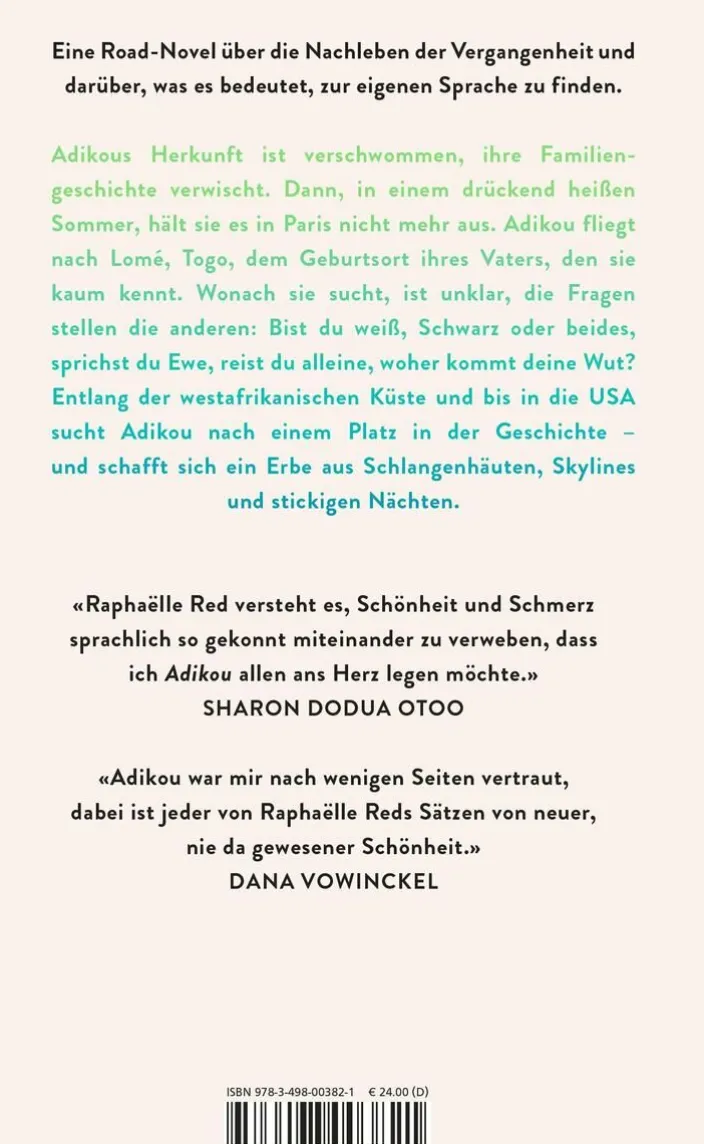 Eine Road-Novel über die Phantome der Vergangenheit, über Scham und über Wut und darüber, was es bedeutet, bei sich zu sein. Adikous Herkunft ist verschwommen, die Spuren ihrer Familiengeschichte sind verwischt, sie weiß nicht einmal, wie man ihren Namen richtig ausspricht. Dann, in einem drückend heißen Sommer, hält sie es in Paris nicht mehr aus. Adikou fliegt nach Lomé, Togo, dem Herkunftsort ihres Vaters, den sie nicht kennt. Wonach sie sucht, ist ihr nicht klar, die Fragen stellen die anderen, bei der Passkontrolle, in den Loméer Imbissen, den Unterkünften, dauernd: Wer ist dein Vater, bist du weiß oder schwarz oder beides, wie fühlt es sich an, als Frau alleine zu reisen, sprichst du Éwé, bist du Journalistin, was suchst du hier? Von Togo aus reist Adikou entlang der westafrikanischen Küste bis in die USA. Sie schafft sich ein Erbe aus Schlangenhäuten, Skylines und stickigen Nächten, erforscht Geschichte und Geschichten, Vergangenheit und Gegenwart – bis sie den Worten des verschwundenen Vaters lauschen kann.