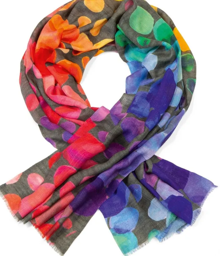 Der dunkle Schal mit dem fröhlichen Tupfenmuster schillert in allen Farben des Regenbogens.