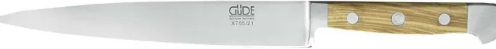 Alle Klingen der GÜDE Messer sind aus einem einzigen Stück Chrom-Vanadium-Molybdän-Stahl geschmiedet, scharf, sehr robust und rostfrei. Auch die Form der Messer ist bis ins kleinste Detail durchdacht und von Funktion und perfekter Handhabung geprägt. Sie liegen griffig und bequem in der Hand, lassen sich sicher führen und ermöglichen präzises, müheloses Arbeiten. Doch nicht nur in ihrer Funktionalität ist die Gestaltung außergewöhnlich, auch visuell lassen die Produkte durch ihre formvollendete Eleganz keine Wünsche offen. Das Schinkenmesser aus der Manufaktur »GÜDE« ist ein Messer, das in keinem Haushalt fehlen sollte. Durch seine lange schmale Klinge ist das Schinkenmesser ideal für das feine Schneiden von Fleischwaren. Die Griffschale besteht aus bis zu 500 Jahre alten und ausgesuchtem Olivenholz, welches sehr hart, witterungsfest, stark gemasert und dadurch besonders elegant ist. Die Klinge ist rostfrei, eisgehärtet und handgeschärft.
