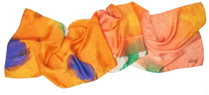 Der zarte Seidenschal zeigt einen Ausschnitt aus einem kleinen Aquarell, das als Buchlesezeichen der Familie Nolde Verwendung fand.