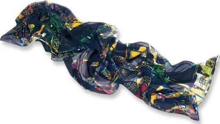 Für Hundertwasser, der sich selbst auch »Dunkelbunt« nannte, waren Regentage inspirierend, denn vor dunklem Hintergrund leuchten die Farben am schönsten. Die Natur liefert mit dem Regenbogen das beste Beispiel. Auf fließendem Crêpe de Chine wirkt Hundertwassers Komposition wie von einem Lichtband durchflutet. Jedes Exemplar variiert leicht im Motivausschnitt und Farbkomposition, so ist jeder Seidenschal ein Unikat.