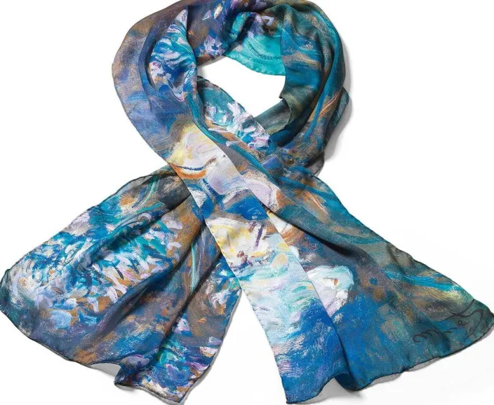 Die Seerosen und Lilien von Monets »Gelbe Seerosen und Agapanthus« entfalten ihre atmosphärische Farbigkeit auf Seidensatin.