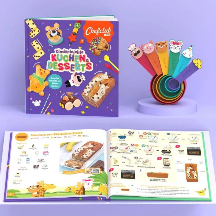 Das Backbuch enthält 25 köstliche Dessertrezepte und lädt mit spannenden Geschichten und historischen Infos zum Entdecken ein. Dank Schritt-für-Schritt-Illustrationen und einem 6-teiligen Messbecher-Set gelingen die Rezepte kinderleicht. Die wasserfesten, abwaschbaren Seiten machen das Buch besonders alltagstauglich. Über die Chefclub-App stehen zusätzliche interaktive Rezeptvideos zur Verfügung – für noch mehr Backspaß!