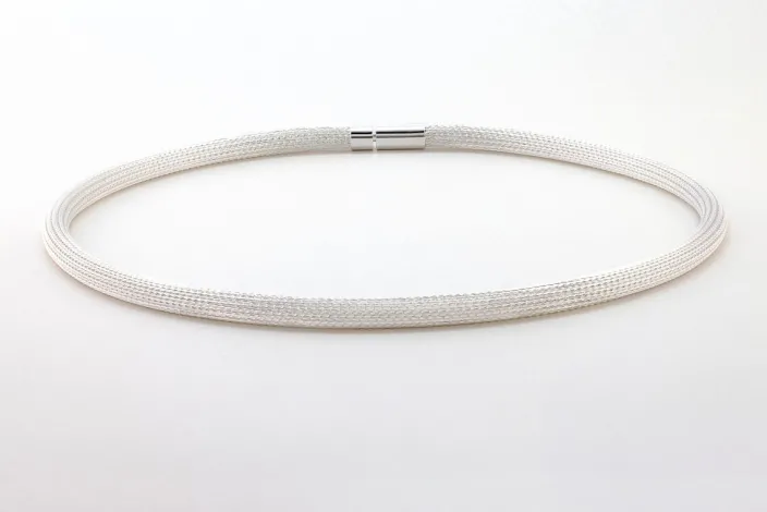 Dieses Collier ist ein sehr edles „Strumpfgeflecht“ ohne Naht aus feinsten Silberdrähten. Der einzigartige Tragekomfort entsteht durch die glatte, anschmiegsame Oberfläche des in sich fließenden beweglichen Geflechts. Die gleichmäßige Rundung bleibt auch dann erhalten, wenn man sie mit einem Anhänger trägt, da sie im Innern verstärkt ist.