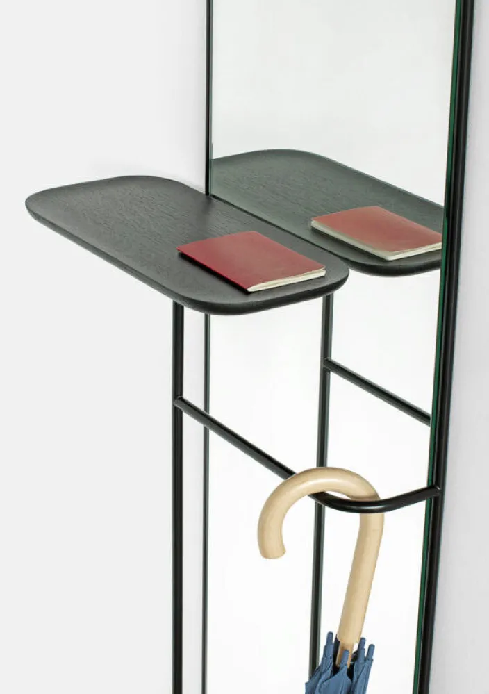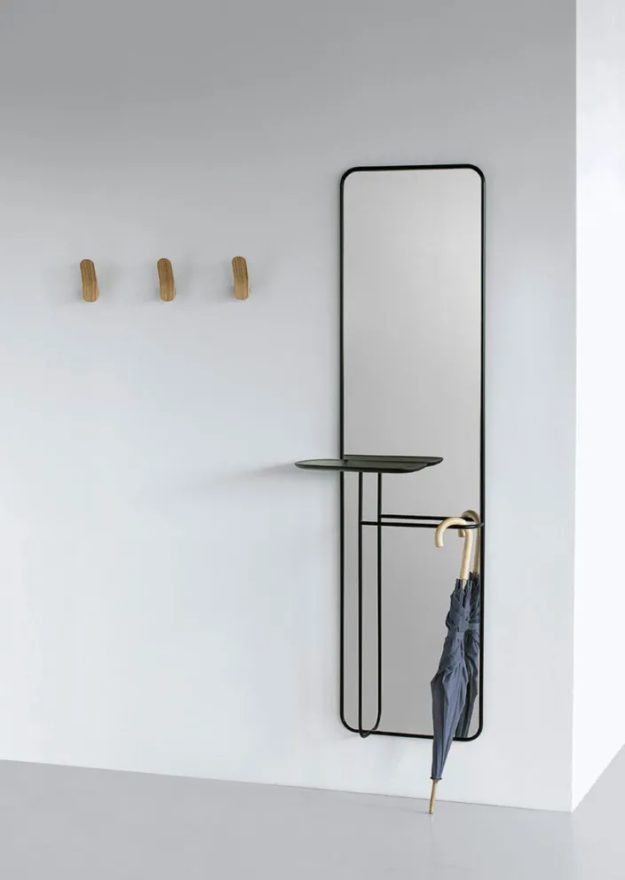 Der Spiegel zeichnet sich durch eine klare und minimalistische Ästhetik aus und ist ein praktisches und vielseitiges Möbelstück für den Flur, eine Mischung aus Kleiderschrank, Regal und Spiegel. Das Tablett aus massivem Eichenholz bietet bereits beim Betreten des Flurbereichs die Möglichkeit, Alltagsutensilien wie Schlüssel, Portemonnaie oder Schlüssel zu verstauen. Der schlanke und minimalistische Stahlrahmen bietet Platz zum Aufhängen von Regenschirmen und Schals.