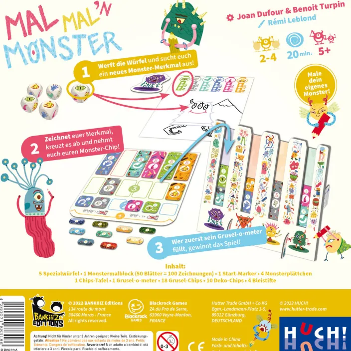 Die Monster sind los – wer schafft es, das gruseligste Monster aller Zeiten zu zeichnen? Mit dem kreativen Spiel »Mal mal’n Monster« wird jede Spielrunde zum Monster-Spaß für Groß und Klein. Zeichne dein eigenes Monster und sammle Grusel-Chips (Arm, Bein, Zahn, …), um deinen Gruselwert im Grusel-o-Meter zu steigern. Wer seine Chips zuerst platziert, gewinnt die Runde und sorgt für ein monstermäßiges Lachen am Tisch. Ein kreatives und schnelles Spiel für die ganze Familie.