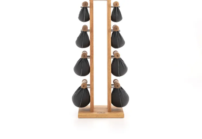 Alle Swing Hanteln werden von Hand genäht und sind mit einem Eisengranulat befüllt, welches die Unwucht in der Bewegung unterstützt, da es sich im Ledersack verlagern kann. Nach dem Workout können Sie Ihre acht Swing Hanteln aus handgenähtem Echtleder am Swing Turm platzsparend und optisch ansprechend verstauen.