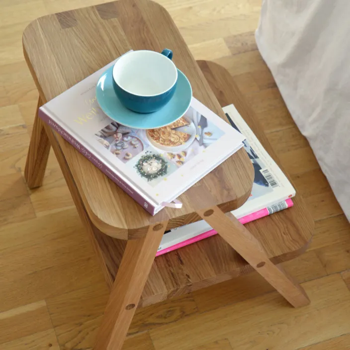 Kompakt, vielseitig und stabil – dieser formschöne Allrounder aus massivem Holz vereint Sitz- und Tritthocker sowie Beistell- und Nachttisch in einem. Seine robuste Konstruktion aus Eiche natur geölt gewährleistet Zuverlässigkeit und Langlebigkeit, besonders unter Belastung. Gefertigt in Deutschland.