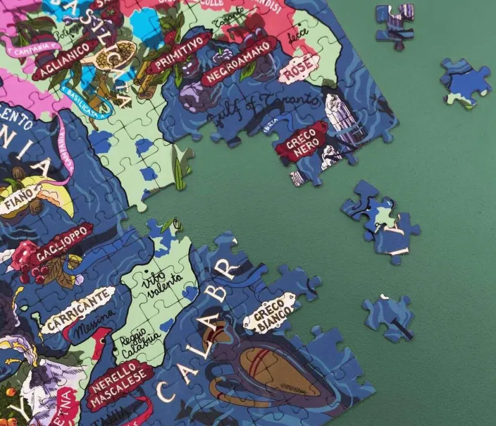Unser Italien-Puzzle nimmt Sie mit auf eine Reise durch die außergewöhnlichen Weinregionen des Landes, ein Teil nach dem anderen. Dieses fachmännisch gefertigte und wunderschön illustrierte Puzzle fängt die Essenz der italienischen Weinherstellung ein, indem es die Rebsorten hervorhebt, die Italien zu einem der beliebtesten Weinziele der Welt gemacht haben. Von Sangiovese über Nebbiolo bis hin zu Glera – das Puzzle zeigt die charakteristischen Rebsorten auf der Karte und feiert ihre einzigartigen Aromen und Eigenschaften.