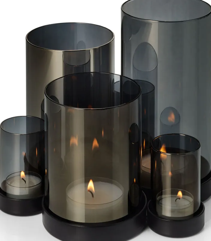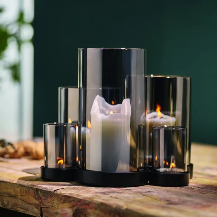 Das Design kombiniert hochwertige Materialien zu einem eleganten Gesamtbild. Die Glasröhren ruhen auf einem pulverbeschichteten Stahlsockel in mattschwarz, der einen stilvollen Kontrast zur glänzenden Oberfläche des Glases bildet. Das dunkle, verspiegelte Glas verleiht dem Ensemble eine besondere Eleganz und macht es zu einem Highlight in jeder Dekoration.