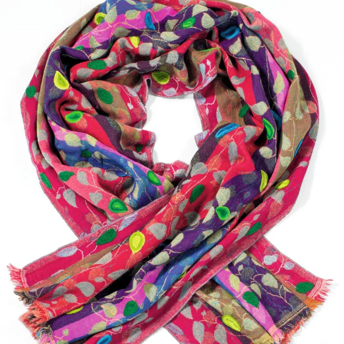 Handgestickte Blattformen machen diesen besonders farbenfrohen Schal »Hojas« zu einem Unikat.