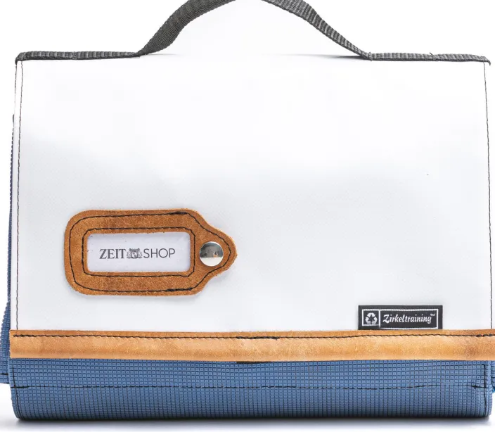 Wer viel unterwegs ist und auswärts nächtigt, sollte nicht nur auf nachhaltige Pfegeprodukte setzen, sondern sich auch für ein Behältnis mit Upcycling-Anteil und Mythos Turnstunde entscheiden. Hiermit macht ihr in jeder Sammelumkleide auf Euch aufmerksam – rollbare bzw. einklappbare Kulturtasche aus gebrauchtem Sportgeräte-Leder und recycelter Turnmatte mit Front aus LKW-Plane. Das Innenfach ist mit schwarzem Nylon gefüttert und weist mehrere kleine Fächer auf. Diese KulturRolle L hat gegenüber der M noch ein extra „Abteil“ = ein großes Staufach mit Zip. Zusätzlich hat die »KulturRolle« einen Spiegel (hochglanzpolierter Edelstahl) und einen Haken zum Aufhängen.