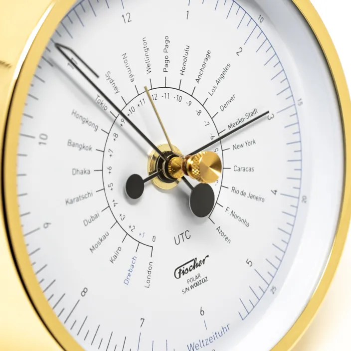 Das Gehäuse der »POLAR« Weltzeituhr (Durchmesser 133 mm, Höhe 45 mm) besteht aus poliertem und lackiertem Messing. Es unterstreicht die Qualität dieser feinen Messtechnik und hebt mit der markanten Phase am Bodenteil die Position an der Wand mit besonderer Leichtigkeit hervor. Jedes einzelne Instrument ist mit einer Serien-Nummer versehen. Die »POLAR« Weltzeituhr wird wie alle Instrumente der Serie POLAR bei FISCHER in Deutschland handgefertigt.