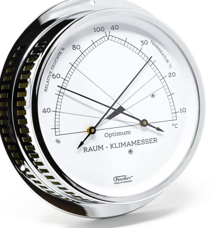 Eigens für DIE ZEIT kreierte die Manufaktur Fischer eine besonders gestaltete Kleinserie dieses edlen Raumklimamessers aus verchromten Messing mit schwarzen Zeigern. Das sorgsam handgefertigte und streng limitierte Produkt misst exakt die Temperatur und die relative Luftfeuchtigkeit im Wohnraum. Ein Blick auf die Schnittstelle der beiden Zeiger reicht, um zu sehen, ob sich das Raumklima im optimalen Bereich befindet oder ob Maßnahmen wie Heizen, Befeuchten oder Lüften erforderlich sind, um eine gesunde Wohlfühlumgebung zu erzeugen. Diese Kombination aus Haarhygrometer und Bimetall-Thermometer ist ein hervorragendes Beispiel feinmechanischer Messtechnik. Nahezu alle Komponenten dieses Präzisionsgerätes fertigt, montiert, justiert und prüft Fischer im eigenen Haus.