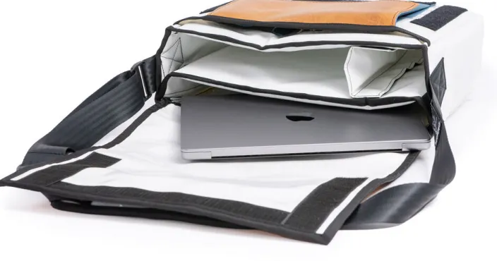 - Material: Gebrauchtes Sportgeräte-Leder (Taschendeckel), weiße LKW-Plane (im Taschenkörper)